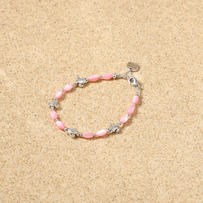 Ce bracelet coloré Mana est idéal pour le poignet d'un enfant. Il apportera de la gaieté avec ses perles en nacre rose et ses tortues argentées. Comme un arc en ciel, il apportera plein de joie et de bonheur à l'enfant qui le porte !