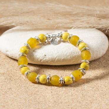 Laissez-vous tenter par ce bracelet frais et plein de poésie, Friendly. Le ruban en polyester moutarde, doux et léger, s’enroule délicatement autour du poignet, tandis que de petites perles en verre rayé apportent une touche colorée. En son centre, un pendentif argenté en forme de coquillage rappelle l’esprit bord de mer. Parfait pour accessoiriser une tenue estivale ou glisser un peu d’océan dans votre quotidien.