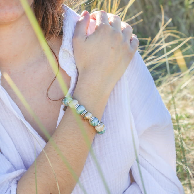Globule est un bracelet élégant et lumineux avec ces perles en céramique aux différentes nuances de bleu pétrole, de beige et de métal argenté.
