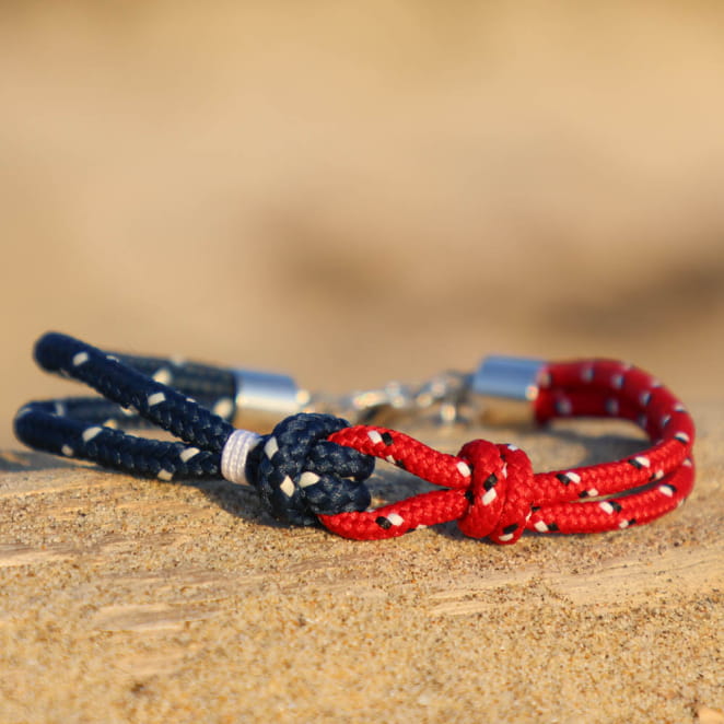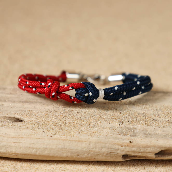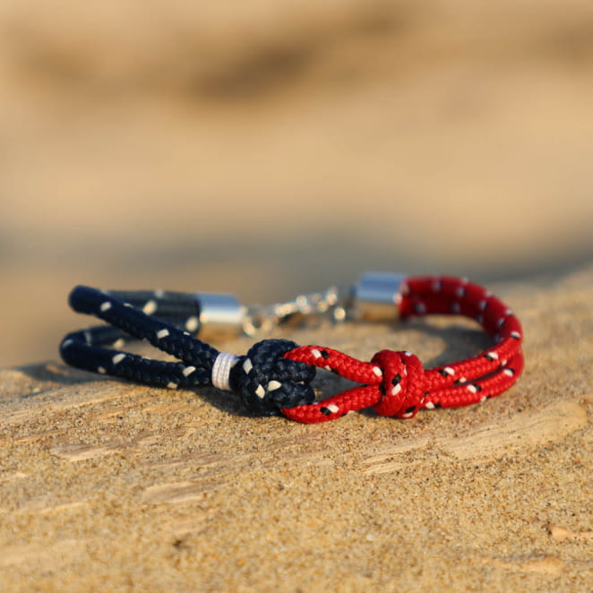 Mettez en valeur votre style avec ce superbe bracelet Dinan, confectionné à la main dans notre atelier. Agrémenté d'un délicat noeud à l'esprit marin au centre, il incarne l'alliance parfaite entre élégance et robustesse. Craquez pour ce bijou rouge et bleu, qui s'adapte à tous les styles, qu'il soit décontracté ou plus formel !