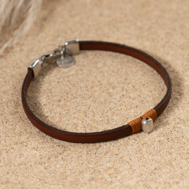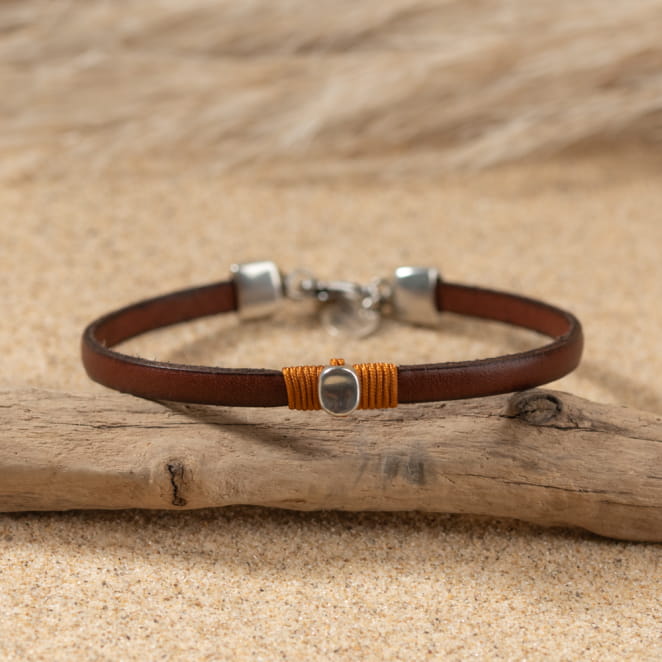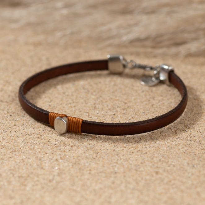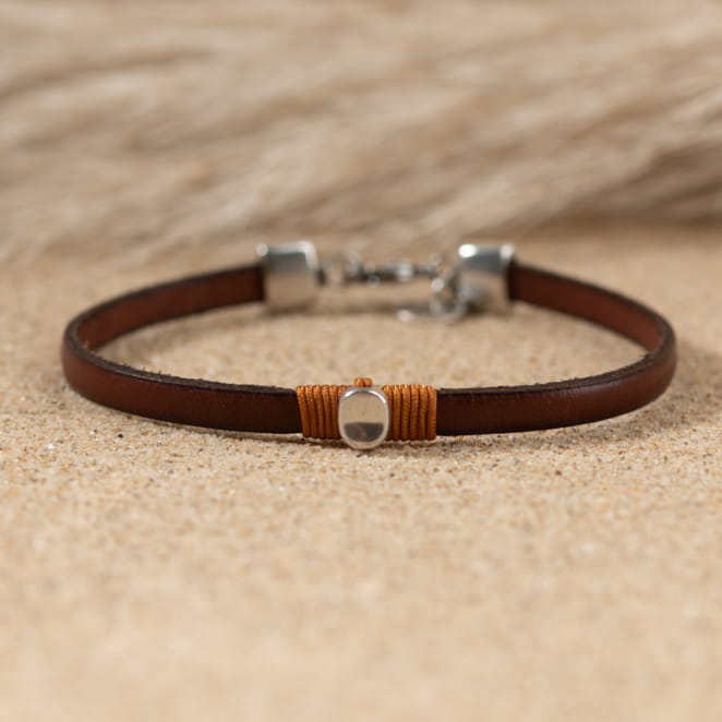 Découvrez le bracelet Djoudi, un bijou masculin élégant. Ce bracelet, avec son ruban en cuir marron, se distingue par sa pastille ovale en métal argenté, subtilement attachée par un fil marron. Avec ses couleurs sobres, il s'adapte à tous les styles, offrant un look viril et lumineux.