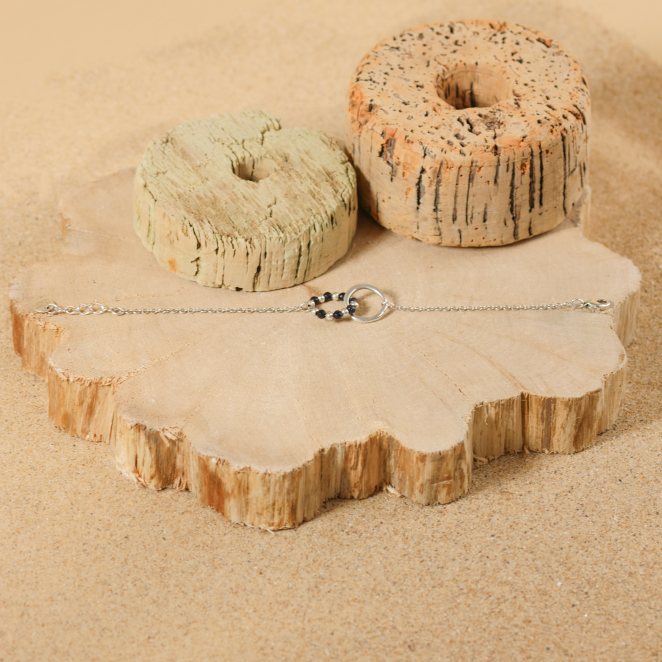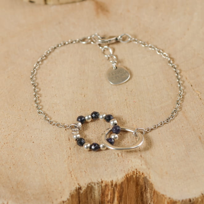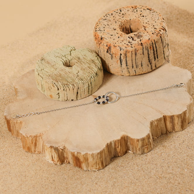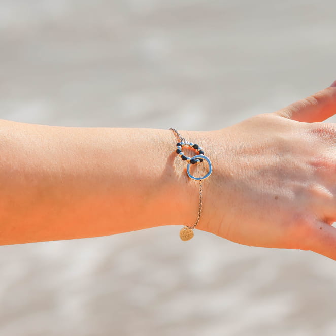 Apportez une touche de délicatesse et de modernité à votre poignet avec le bracelet Isalie. Inspiré par la beauté des nuits étoilées sur l’océan, ce bijou joue avec les formes et les textures pour un rendu à la fois raffiné et intemporel. Une fine chaîne argentée met en valeur un élégant cercle en métal martelé, enlacé dans un anneau de perles bleu marine en pierre de sable et de perles argentées. Subtil et lumineux, ce bracelet femme se porte aussi bien seul qu’en accumulation pour une allure chic et sophistiquée !