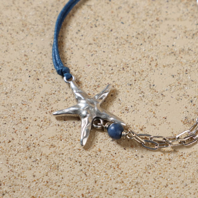 Le bracelet Moliets, est un bracelet fin orné d'une étoile de mer argenté. Il rappelle instantanément les doux souvenirs des vacances en bord de mer. Son design délicat, agrémenté d'une petite perle en quartz bleu, évoque les vagues et le sable chaud des plages. Un accessoire idéal pour celles et ceux qui souhaitent emporter un petit bout d'océan avec eux, tout en restant élégants et authentiques.