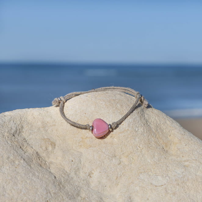 Offrez ce bijou rempli d'amour à votre enfant ! Ce délicat bracelet mousse est agréable à porter grâce à son cordon en lin réglable qui s'adapte à la taille du poignet de votre enfant. Un adorable bijou avec sa perle en céramique en forme de coeur rose.
