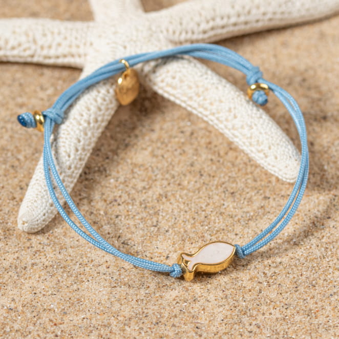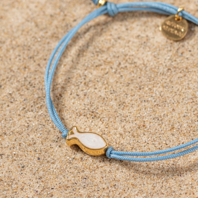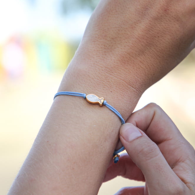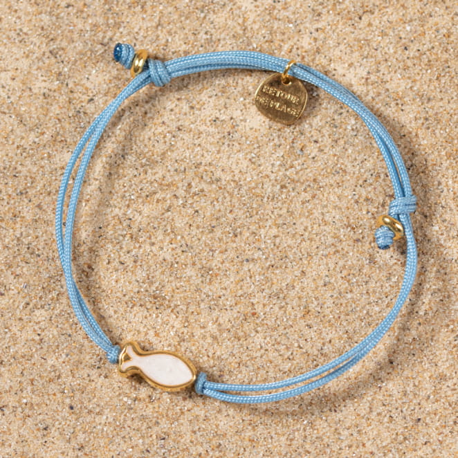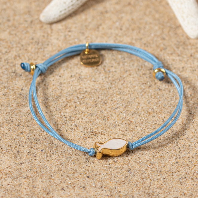 Découvrez le bracelet Nungwi pour femme ! Ce bijou unique se compose d'un cordon bleu gris orné d'une perle en forme de poisson doré et blanc. Parfait pour ajouter une touche de couleur et de fantaisie à votre poignet, il s'adapte à toutes les occasions. Le bracelet Nungwi est l'accessoire idéal pour un style frais et élégant.