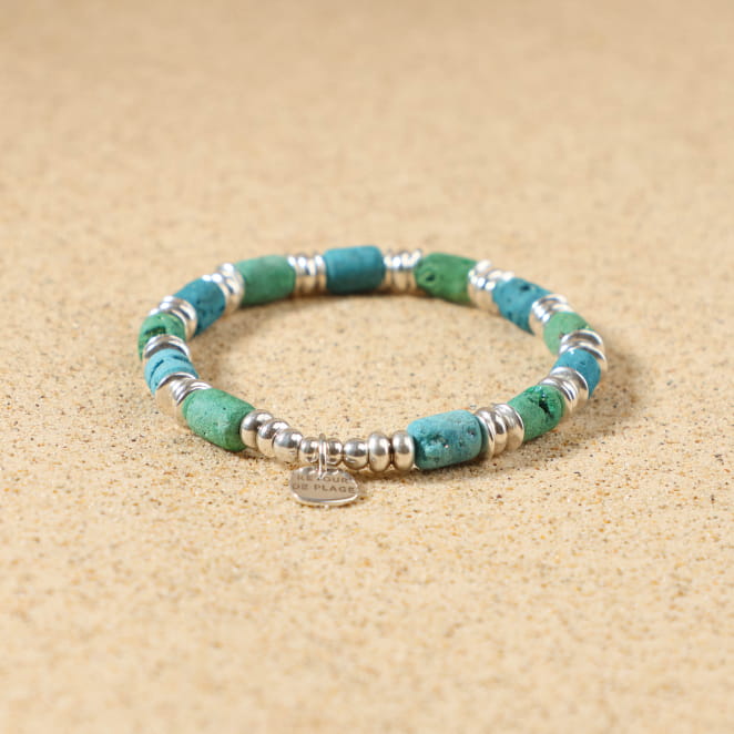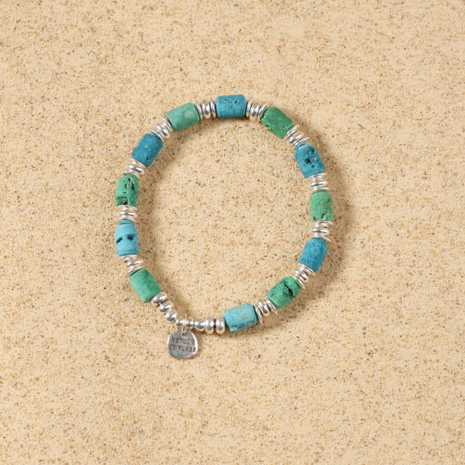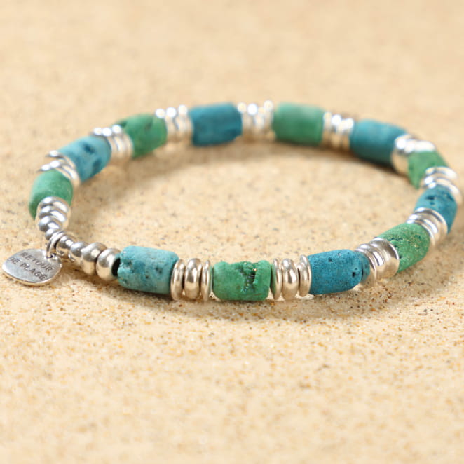 Apportez un vent de fraîcheur à votre poignet avec le bracelet Oda. Cette création évoque les eaux profondes et les pierres que l'on ramasse au détour d'un sentier côtier. Monté sur un fil élastique résistant, il s'enfile facilement à votre poignet. Une touche de bleu-vert pour les esprits libres et les coeurs d'aventurières !