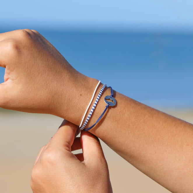 Léger, coloré, toujours prêt à vous suivre : le bracelet Oléron incarne l’esprit de l’île entre ciel et mer. Composé de trois liens fins – blanc, bleu roi et chevron bleu/blanc – il s’ajuste facilement à votre poignet. En son cœur, un médaillon argenté au motif de l'île d'Oléron vous invite à garder le cap, avec élégance.