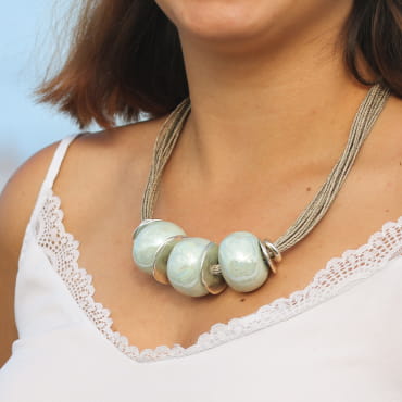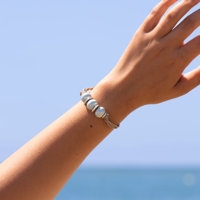 Apportez une touche d'originalité à votre poignet avec notre emblématique bracelet Ville. Ce bracelet mêlant charme et caractère se compose de perles en céramique vert amande et de cordons en lin beige. Un bijou élégant conçu avec une technique historique et unique de Retour de Plage !