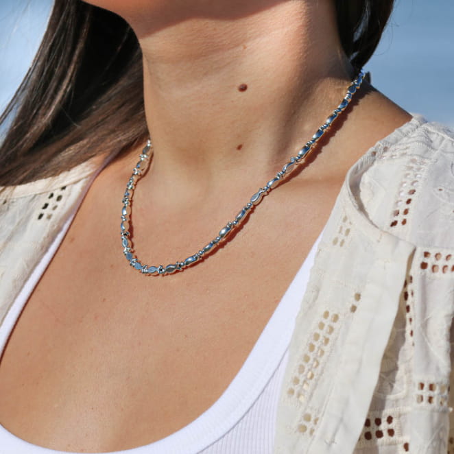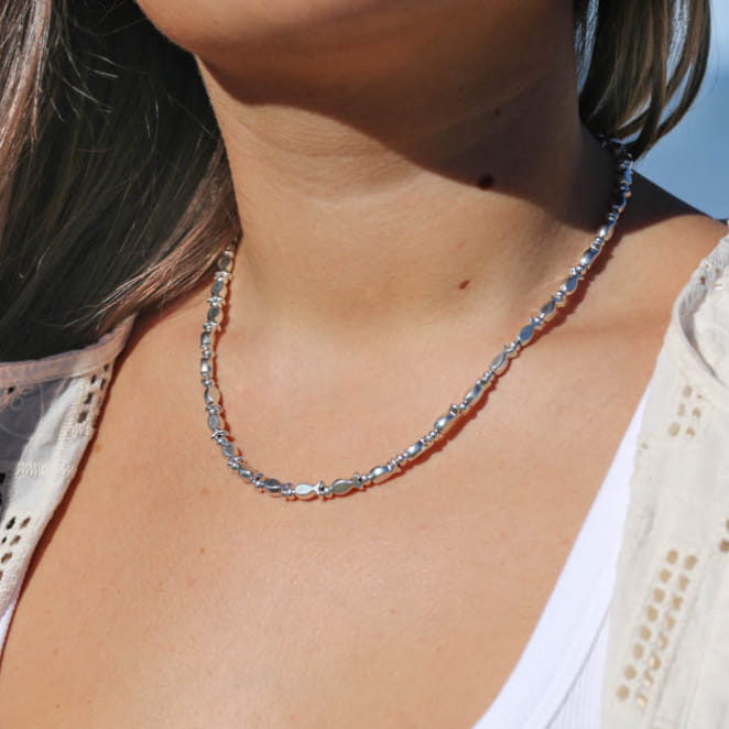 Le collier Kelele se distingue par ses perles en forme de poisson argenté, offrant un design unique et élégant. voir plus