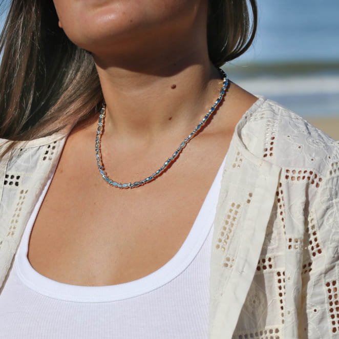 Le collier Kelele se distingue par ses perles en forme de poisson argenté, offrant un design unique et élégant. Ce bijou original ajoute une touche marine et sophistiquée à toute tenue, parfait pour celles qui souhaitent allier style et originalité. Idéal pour un look à la fois audacieux et marin.