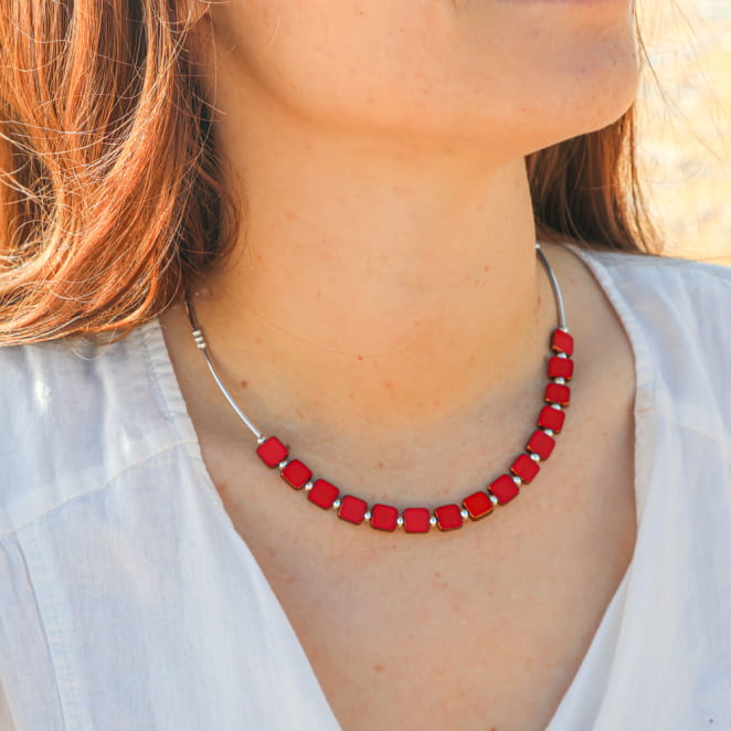 Succombez au charme du collier femme Mosaik. Ce bijou en perles de verre rouge et argenté rappelle les petits carrés de mosaïque, apportant une touche artistique et créative à votre tenue. Élégant et original, il illumine votre décolleté avec délicatesse et poésie. Parfait pour les esprits libres en quête d'un accessoire unique, ce collier vous invite à explorer de nouvelles nuances de style. Adoptez ce collier et laissez sa beauté inspirer vos moments précieux !