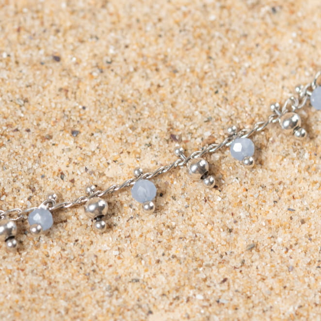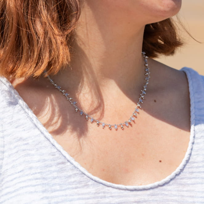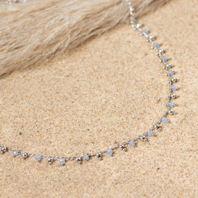 Ce délicat et élégant collier Ronde est un indispensable ! Ses petites perles en verre bleu ciel accompagnées de sa chaine argentée mettent en valeur votre peau. La finesse de ce bijou le rend irrésistible et idéal à porter au quotidien.