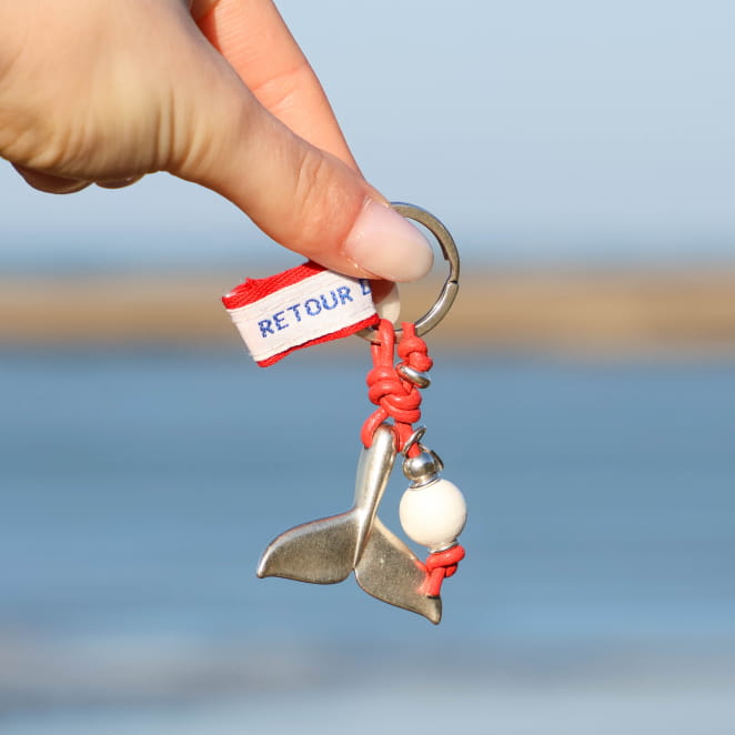 Gardez vos souvenirs de vacances à la mer toujours sur vous avec le porte-clefs Arcachon rouge et blanc ! Son pendentif en métal argenté en forme de queue de baleine vous aide à regrouper vos clés.
