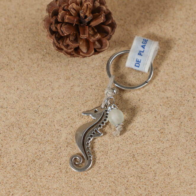 Tiwara est un porte-clefs fait avec passion pour les amoureux de la mer ! Simple et délicat, il saura vous accompagner au quotidien pour ne jamais perdre vos clefs avec son pendentif en forme d'hippocampe, sa perle en verre blanc et son cordon en cuir.