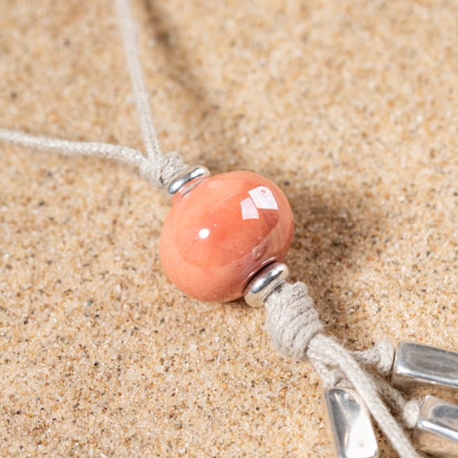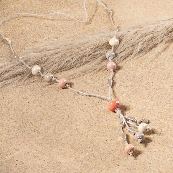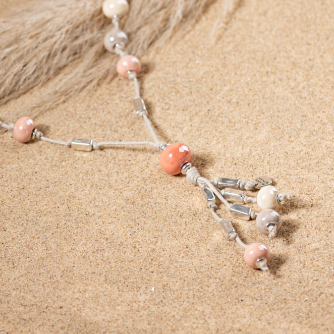 Le sautoir Sepia enchante par ses perles en céramique saumon multicolore. Combinées à des perles en métal argenté, elles illuminent votre teint. Fabriqué en lin naturel, ce bijou apporte une touche de couleur vive et d'éclat à votre tenue, pour un style raffiné et lumineux.