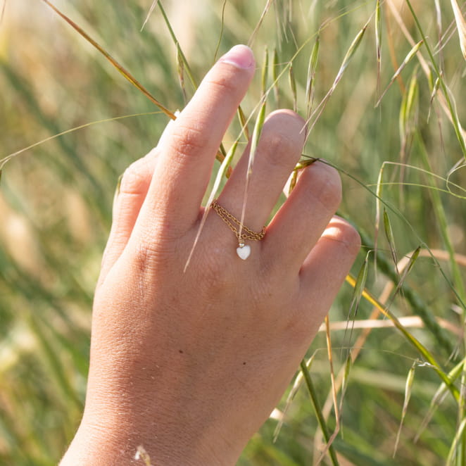 Découvrez la bague pour femme Isée, une pièce unique et raffinée. Composée d'une double chaîne dorée et d'un pendentif cœur en nacre blanche, elle incarne l'élégance et la délicatesse. Parfaite pour ajouter une touche de charme romantique à votre look, la bague Isée est un accessoire incontournable pour les amatrices de bijoux sophistiqués.
