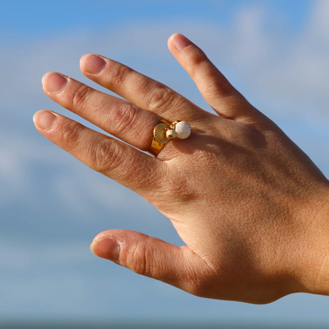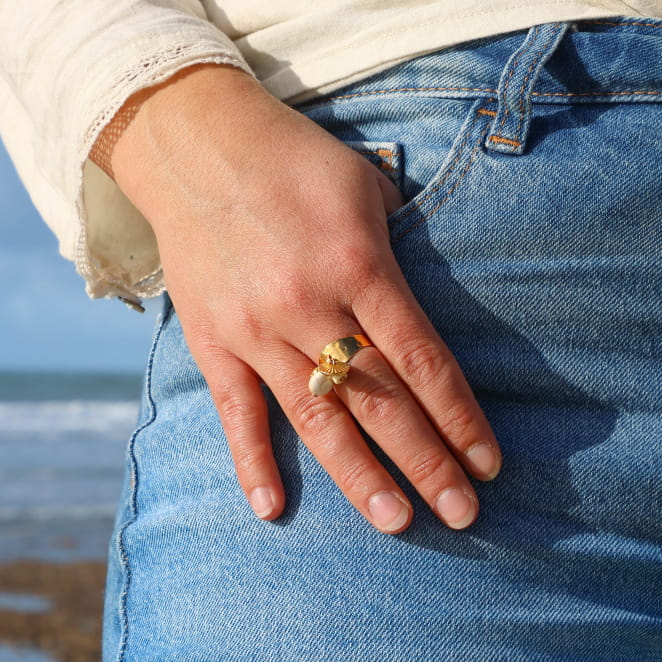 Optez pour notre bague pour femme Lucie ! Son oeil de Sainte-Lucie est un coquillage méditerranéen qui s'harmonise avec sa petite perles en Howlite beige et son pendentif doré. Elegante et moderne, elle deviendra votre meilleure amie.