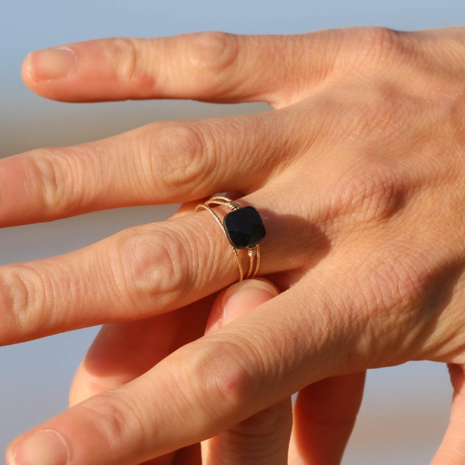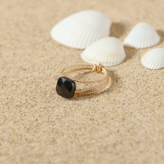 La bague Martinaise, ornée d'une perle en hyperstène noire est sublimée par un fil gold filled doré, symbolisant compassion et bienfaits du corps. voir plus