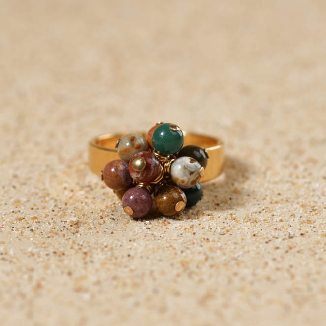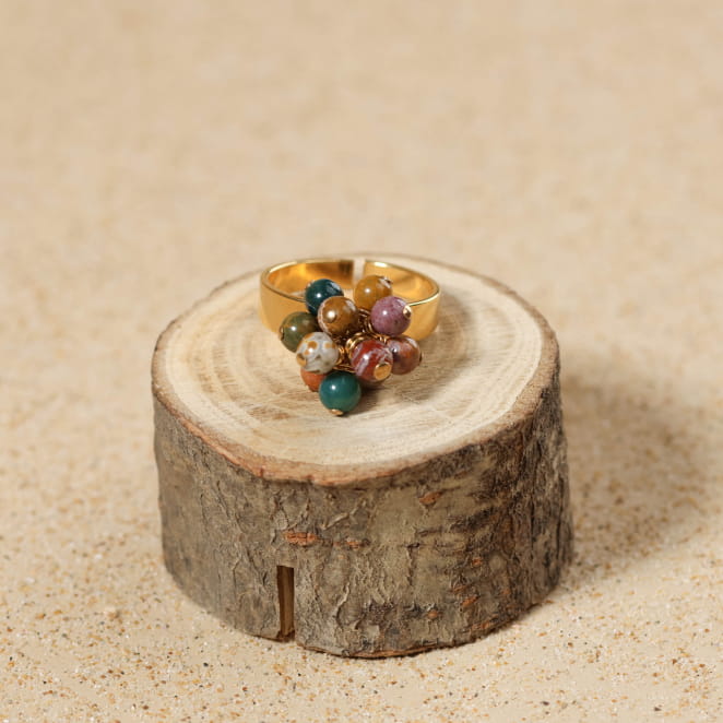 Optez pour cette bague réglable Thais, un bijou délicat et lumineux qui capture l’essence des vacances au bord de mer. Ses perles naturelles en jais multicolore apportent une touche d’évasion et de douceur, tandis que sa finition dorée à l’or fin 24K évoque le soleil et la chaleur de l’été. Un accessoire parfait pour sublimer chaque instant avec authenticité.