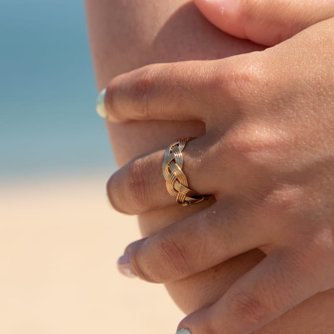 Une bague au joli tressage en métal doré d'un flash d'or 24 carats, adaptable à tous les doigts étant réglable.