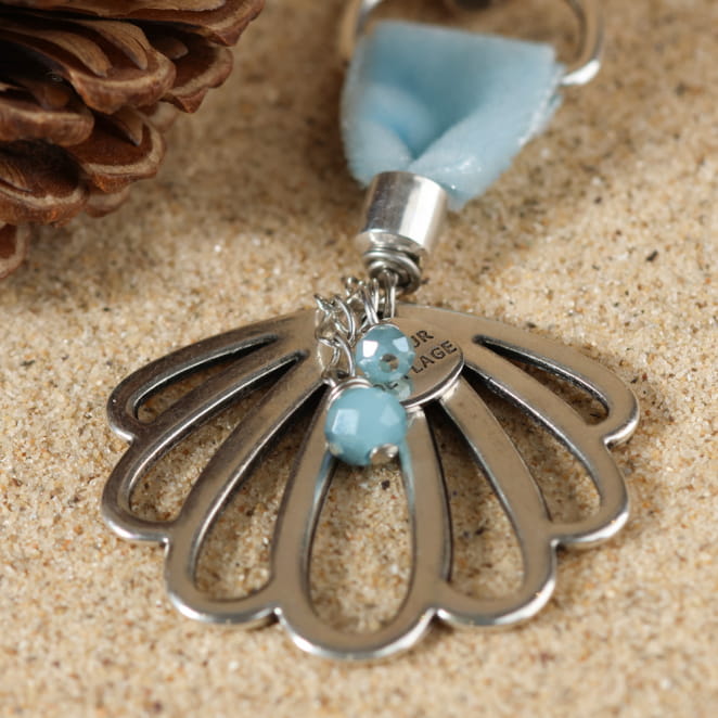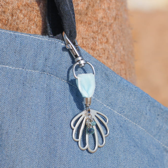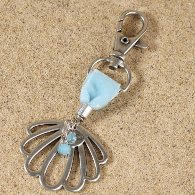 Ajoutez une touche de fraîcheur avec le bijou de sac Meria, orné d'un pendentif coquillage argenté, délicatement rehaussé de détails bleu ciel. voir plus