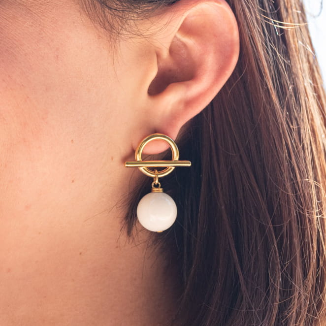 Les boucles d’oreilles Aida illuminent votre visage ! Ces deux anneaux en métal doré révèlent deux perles en verre blanche qui apportent éclat et lumière à votre teint.