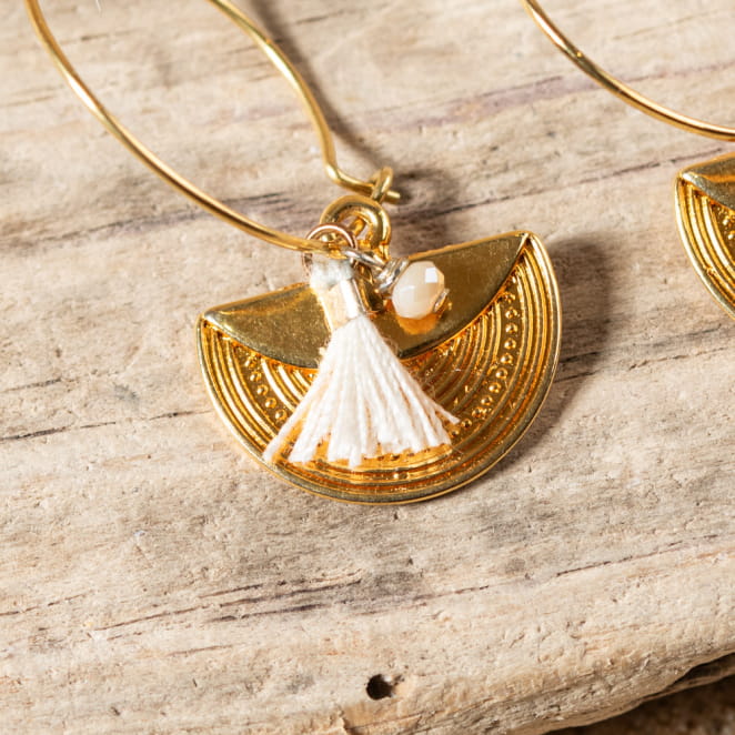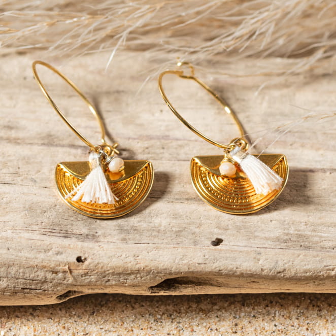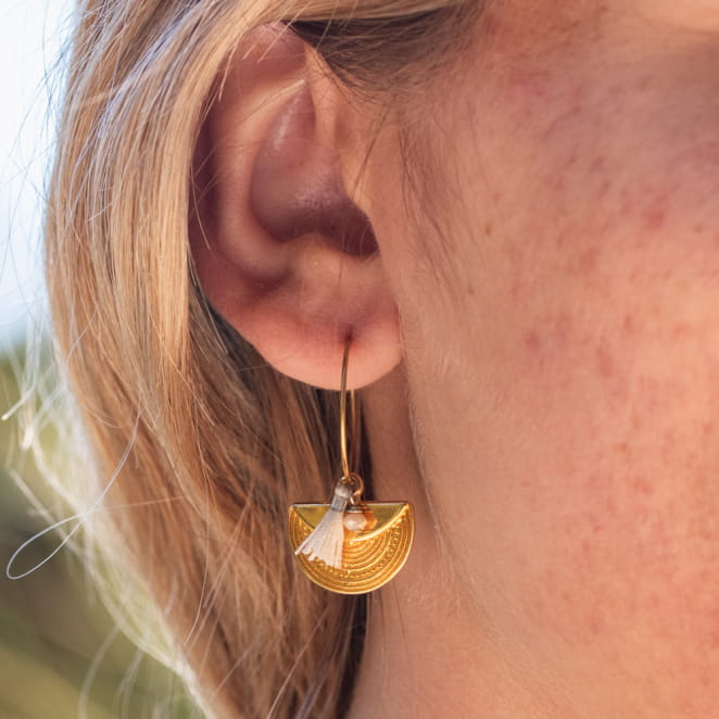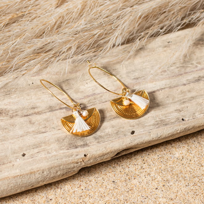 Adoptez le charme délicat des boucles d'oreilles Ajjer, ornées d'une petite perle et d'un discret pompon beige, ces bijoux subliment votre style avec une élégance discrète. Parfaits pour toutes les occasions, les Ajjer ajoutent une note raffinée à votre tenue, alliant la brillance du doré à la touche ludique des détails soigneusement choisis.