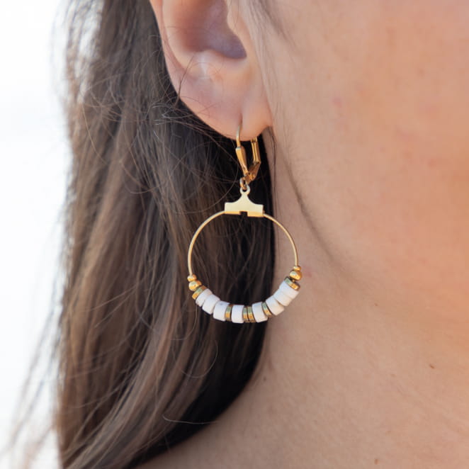 Les élégantes boucles d'oreilles Alchimie apportent de la délicatesse et de l'originalité à votre visage au quotidien avec leurs pierres en howlite beige et leurs rondelles en hématite dorée. Chacune des pierres de ces créoles sont différentes, ce qui permet de le rendre unique !