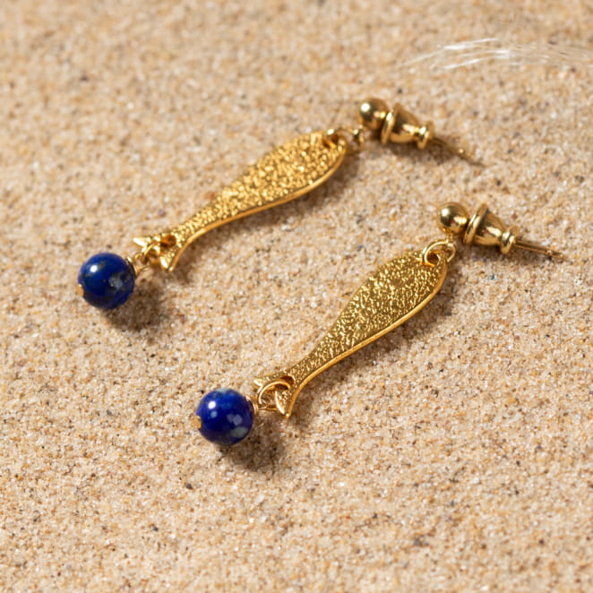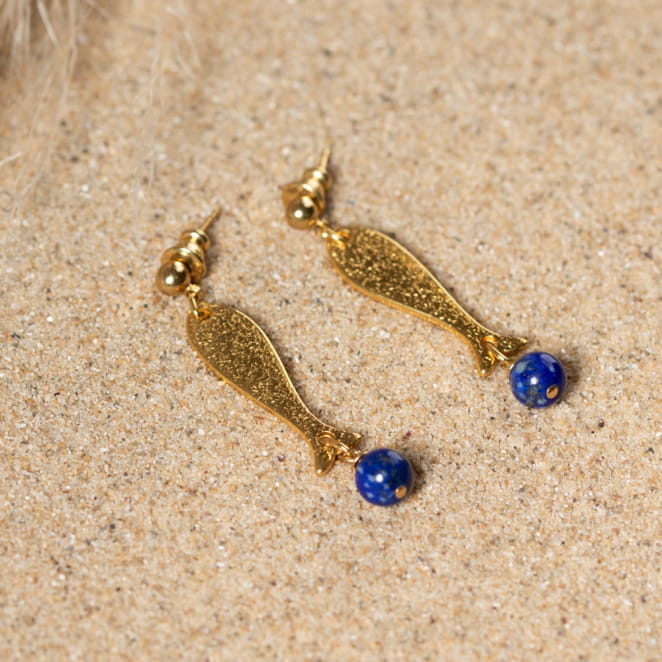 Les boucles d'oreilles Alix, ornées de pendentifs poisson doré et de perles bleu dur, combinent originalité et élégance. voir plus