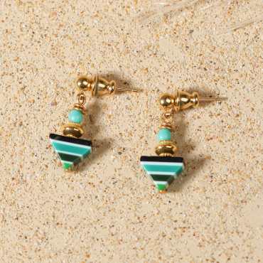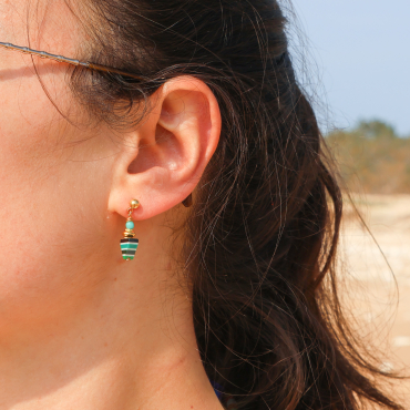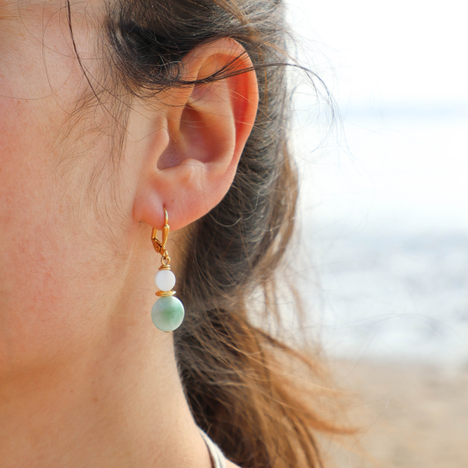Plongez dans une ambiance apaisante avec ces boucles d’oreilles Amandier, un duo de douceur et de lumière. Ces boucles d’oreilles pour femme associent une perle en angelite verte et une perle en nacre blanche, montées sur une dormeuse dorée 24K. Un bijou artisanal qui évoque l’évasion et la sérénité du bord de mer, idéal pour celles qui recherchent des accessoires uniques et pleins de charme.