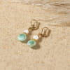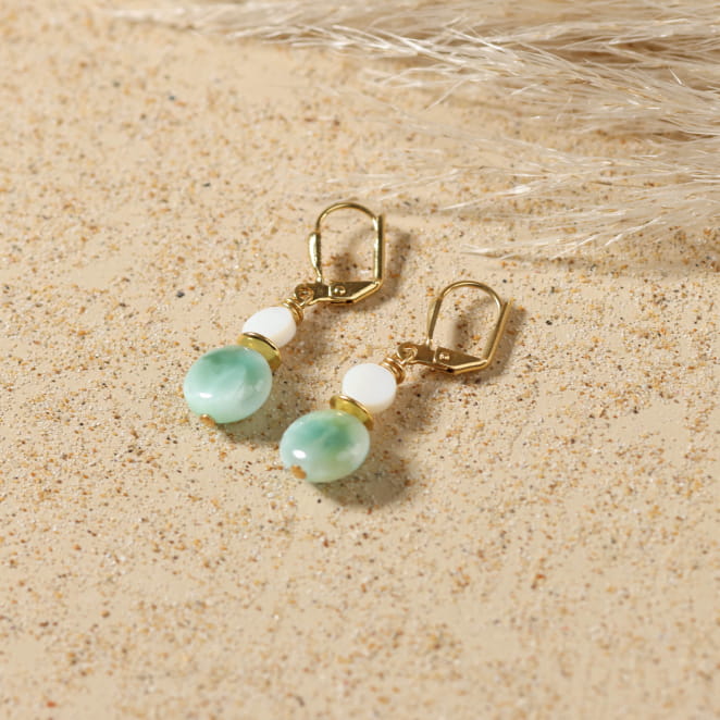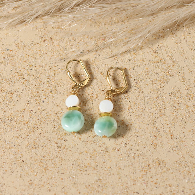 Plongez dans une ambiance apaisante avec ces boucles d’oreilles Amandier, un duo de douceur et de lumière. Ces boucles d’oreilles pour femme associent une perle en angelite verte et une perle en nacre blanche, montées sur une dormeuse dorée 24K. Un bijou artisanal qui évoque l’évasion et la sérénité du bord de mer, idéal pour celles qui recherchent des accessoires uniques et pleins de charme.