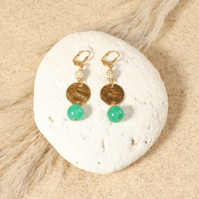 Laissez-vous séduire par les boucles d'oreilles Aminata. Dorées, blanches et vertes, elles sont une invitation à l'évasion et à la douceur des vacances en bord de mer. Composées d'une graine de lotus et d'une perle en aventurine verte, ces boucles harmonieuses évoquent la sérénité des plages sauvages et les trésors cachés de l'océan. L'aventurine verte, connue pour ses vertus apaisantes, apporte une touche de tranquillité à votre quotidien. Laissez ces boucles d'oreilles artisanales vous accompagner au quotidien !