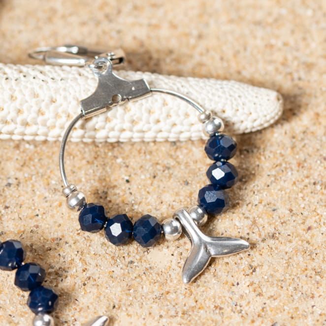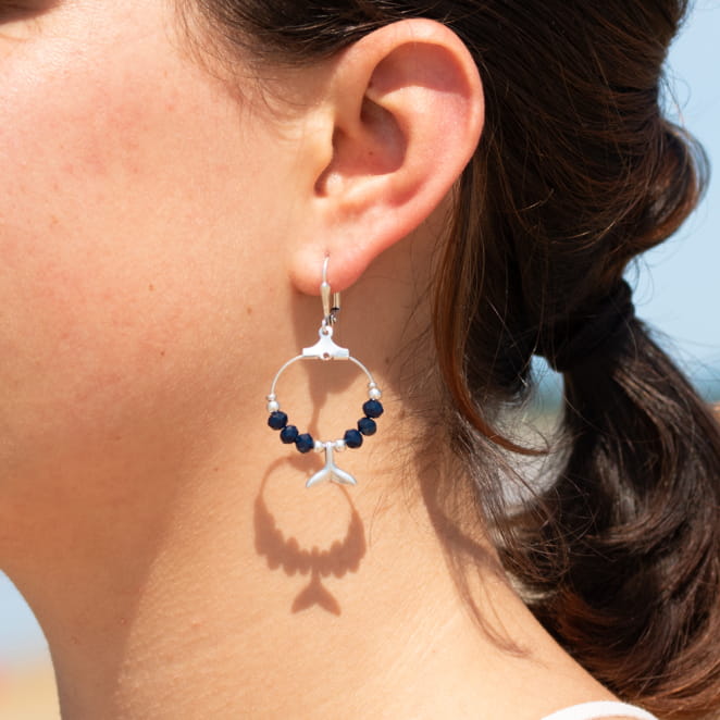 Une sensation d'évason avec les boucles d'oreilles Arcachon ! Ces boucles pendantes en argent avec leurs perles en verre bleu profond évoquent l'océan infini. Le pendentif argenté en forme de queue de baleine évoque l'océan instantanément.