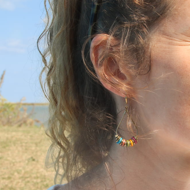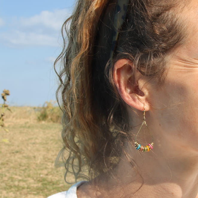 Laissez la joie des couleurs vibrantes éclairer votre look avec nos boucles d'oreilles Arlequin. Les perles rondelles multicolores suspendues par un anneau en forme de goutte doré évoquent la gaieté et la créativité. Associez-les avec le bracelet et le collier assortis pour une harmonie parfaite.