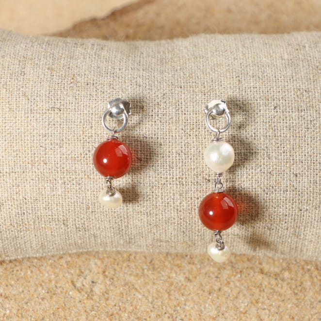 Optez pour les boucles d'oreilles Arlettie, un bijou qui marie simplicité et douceur, ces pièces évoquent la nature et les paysages lumineux de la côte. Ces petites boucles, composées de perles de rivière blanches et de perles en pierre rouge, s’associent à l'argenté. Elles sont discrètes et raffinées.