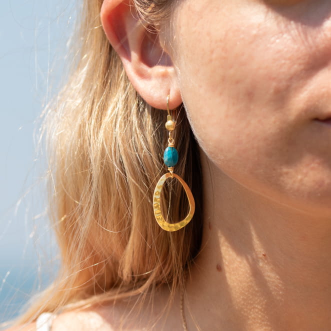 Découvrez les boucles d'oreilles Aruba, un bijou envoûtant mariant élégance et inspirations marines. Le pendentif ovale doré déstructuré offre une allure contemporaine, magnifié par une perle en apatite bleue, rappelant les eaux cristallines de l'océan. Ces boucles d'oreilles captivent par leur finesse, incarnant la splendeur de la mer.
