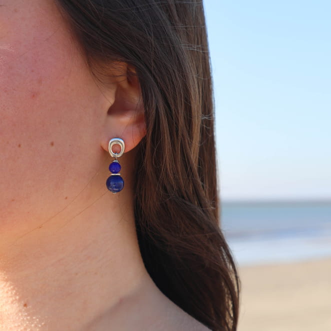 Découvrez les boucles d’oreilles colorées Asti, une création artisanale qui marie la fraîcheur d’une perle en verre bleue et la profondeur d’une perle en lapis lazuli bleue avec l'éclat de sa perle argentée. voir plus