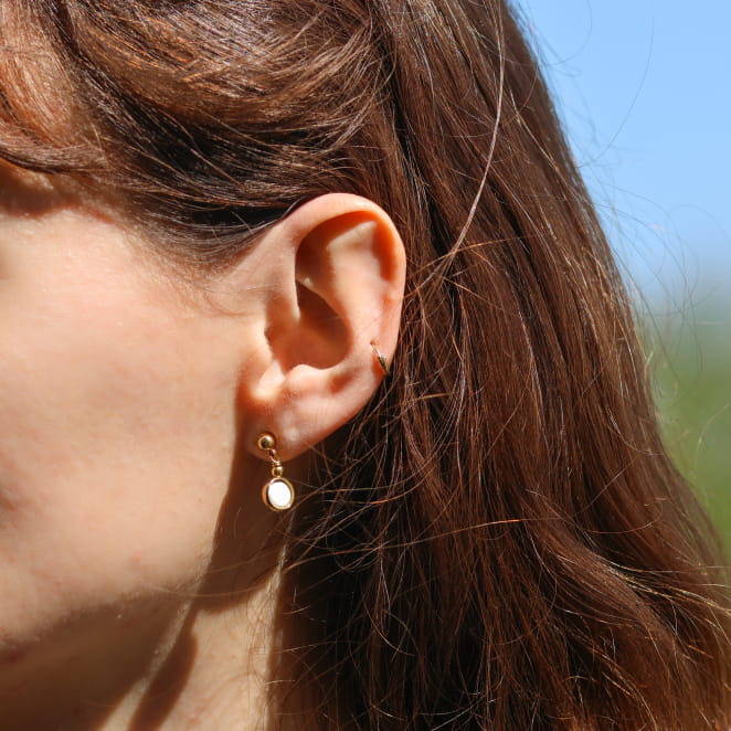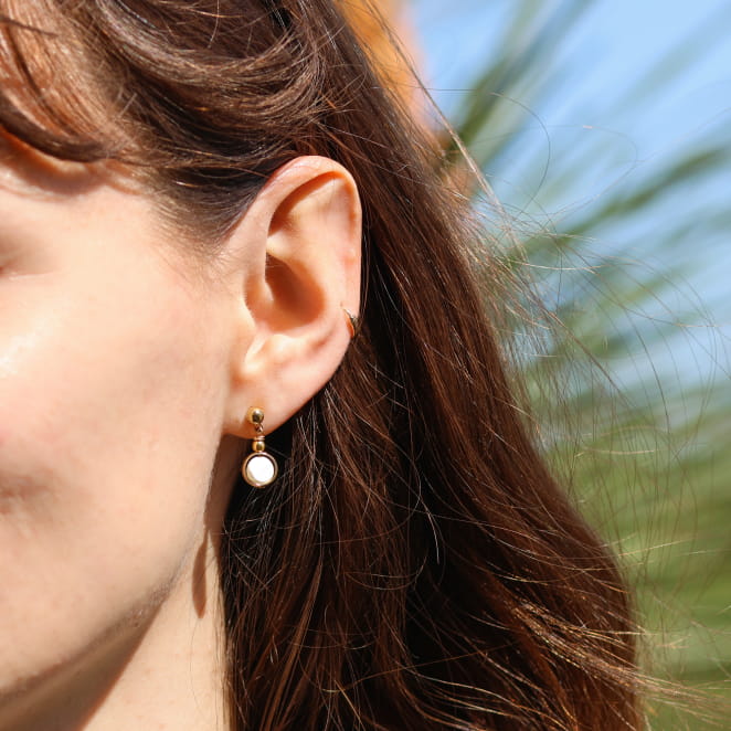 Des perles de nacre blanche nichées dans des pendentifs dorés font de ces petites boucles d'oreilles un bijou élégant. Grâce à sa simplicité et son charme, ces boucles d'oreilles Astrid illuminent votre visage avec leurs teintes de blanc et de doré.