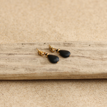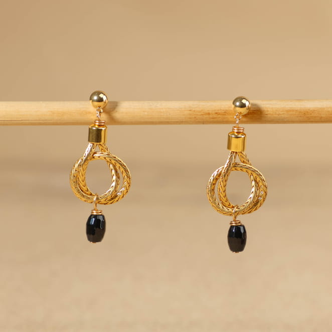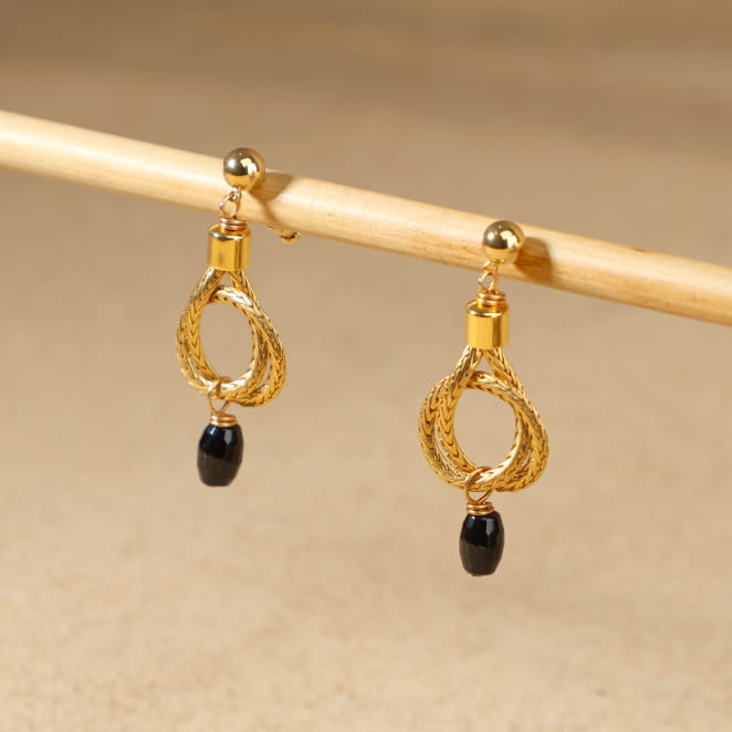 Laissez-vous captiver par ces boucles d’oreilles Athena, où la douceur des perles en agate noire rencontre la luminosité des chaînes tressées en métal doré à l’or fin 24 carats. voir plus