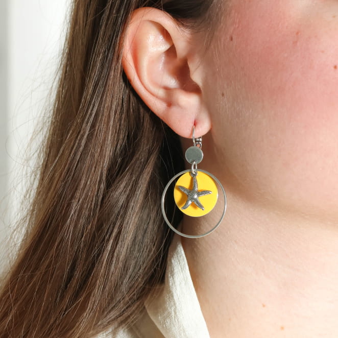 Ensoleillez votre visage avec ces délicates boucles d'oreilles Babette. Un bijou qui vous transporte en vacances au soleil sur la plage avec ses pendentifs ronds jaunes et ses fines étoiles de mer argentées. Fini les journées grisonnantes avec ces boucles d'oreilles aux oreilles !
