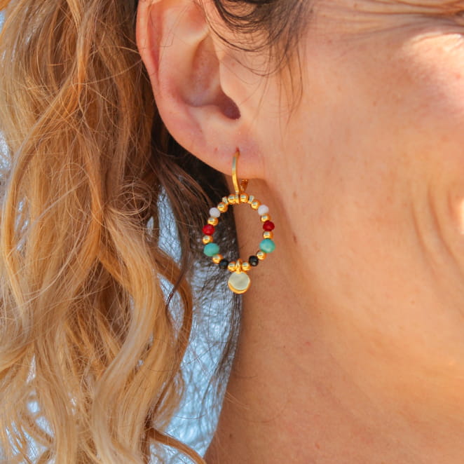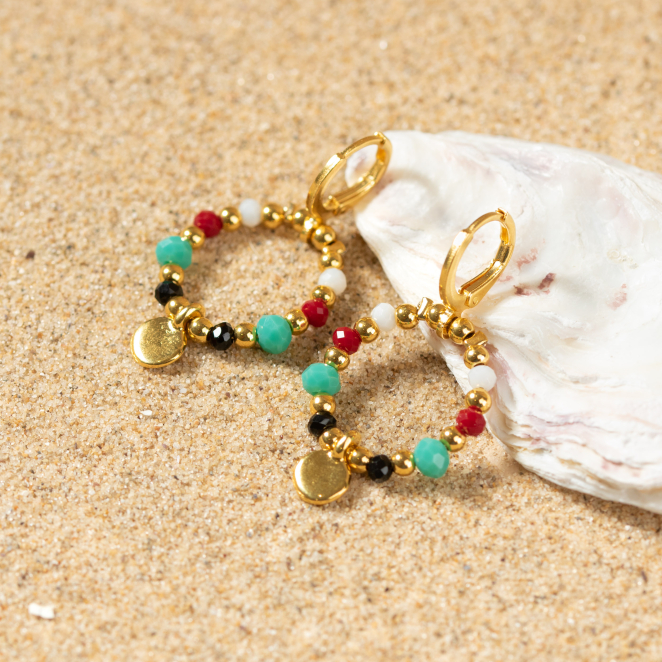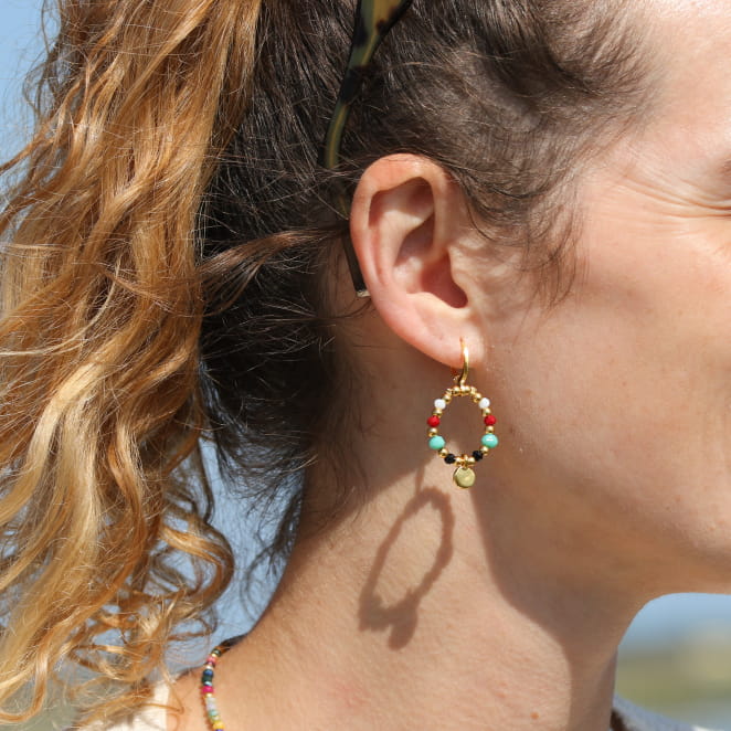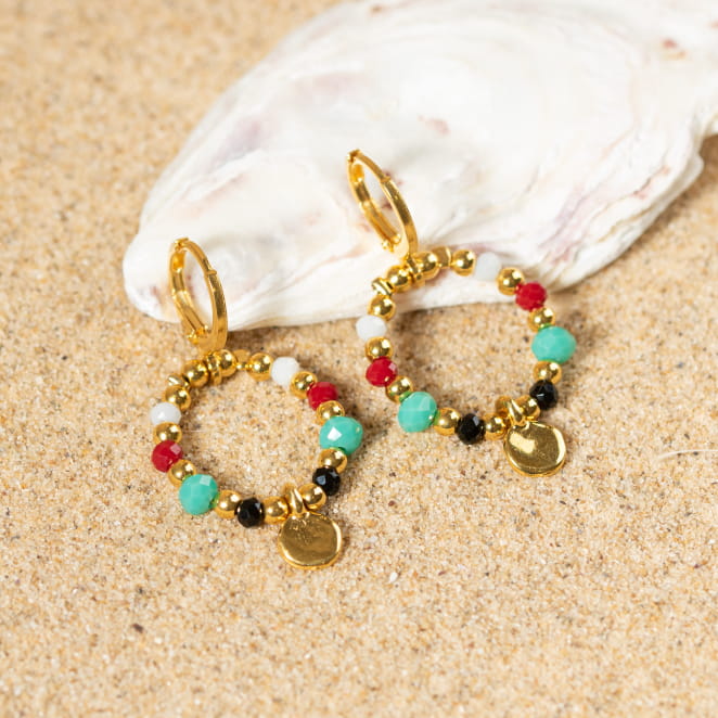 Adoptez un look vibrant avec les boucles d'oreilles Baia ! Ces bijoux mêlent des perles en verre colorées et un pendentif rond en métal doré, pour un style à la fois frais et raffiné. Leur design unique et leur légèreté les rendent parfaites pour sublimer vos tenues !
