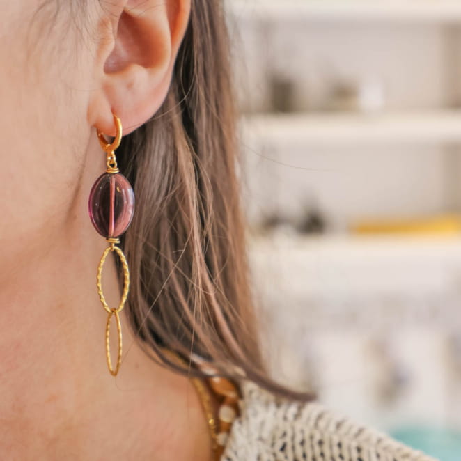 Laissez-vous charmer par les boucles d'oreilles asymétriques Balcon, un incontournable de la saison. Ces longues boucles dorées, ornées de perles violettes éclatantes en verre, s’imposent comme la tendance du moment. Pleines de caractère avec leur asymétrie, elles apportent une note à la fois chic et décontractée, parfaites pour sublimer vos tenues.
