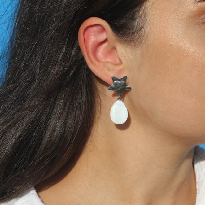 Laissez-vous séduire par les boucles d'oreilles Baleares, ornées d'une étoile argentée, suivie d’un pendentif en forme d'ovale blanc. Un bijou élégant et aérien, idéal pour apporter une touche de fraîcheur et d'originalité à votre style.