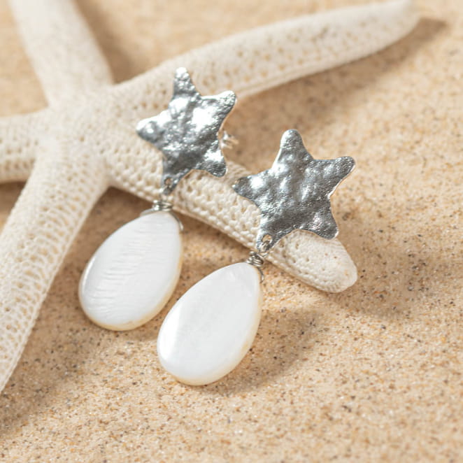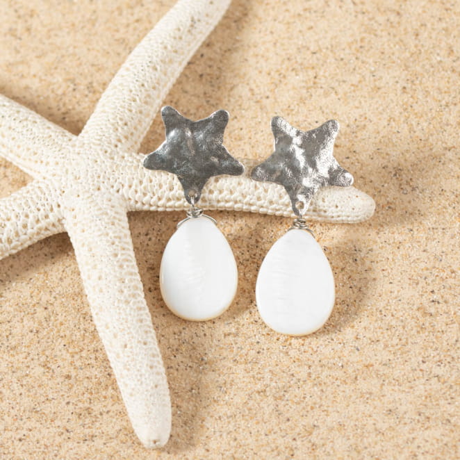 Laissez-vous séduire par les boucles d'oreilles Baleares, ornées d'une étoile argentée, suivie d’un pendentif en forme d'ovale blanc. voir plus