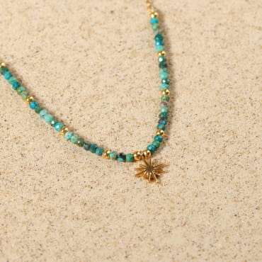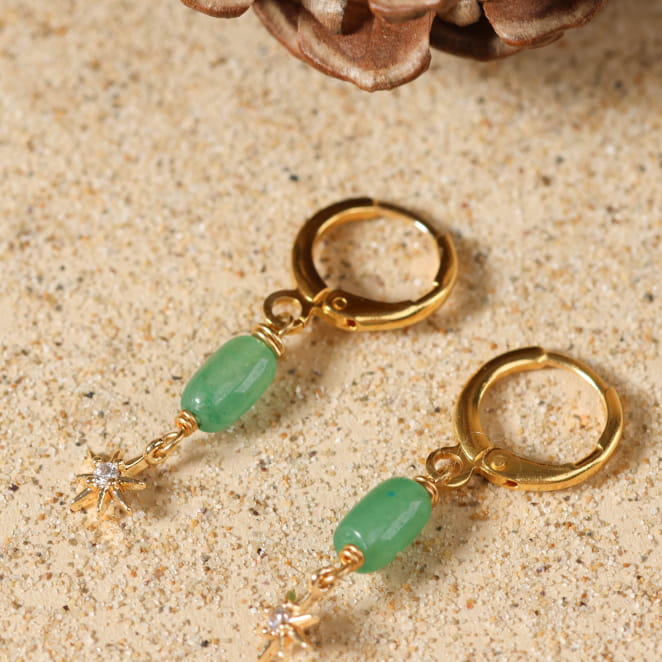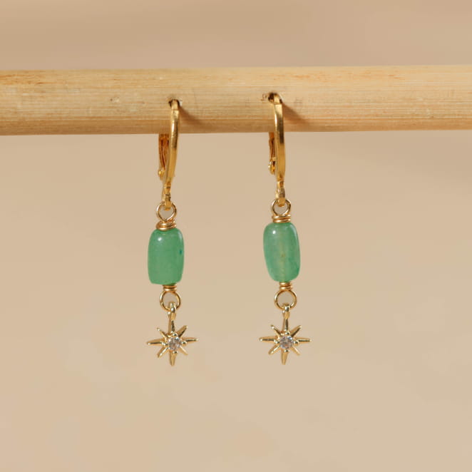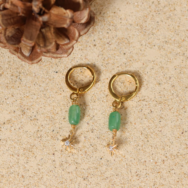 Illuminez votre style avec les petites boucles d’oreilles Bari, sa perle en aventurine verte s’associe à un pendentif en forme d’étoile orné d’un strass scintillant. Ce bijou marie la douceur naturelle de l’aventurine aux reflets étincelants de l’étoile, pour un effet à la fois poétique et délicat. Légères, ces boucles d’oreilles pour femme apportent une touche de magie et de sérénité à votre silhouette en évoquant les jolies couleurs du bord de mer.