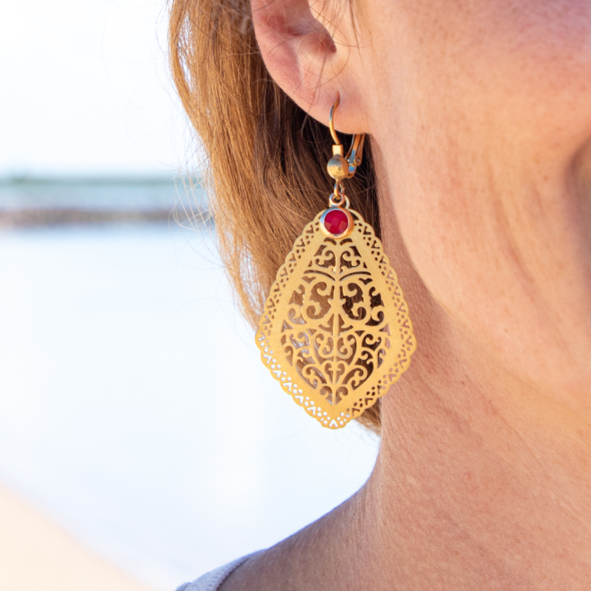 Optez pour les boucles d'oreilles fantaisie Beira, qui allient élégance et originalité ! Avec leur pendentif doré dentelé en forme de goutte et leur pendentif en résine rouge, elles créent un look sophistiqué et audacieux, ajoutant une touche bohème à votre style.