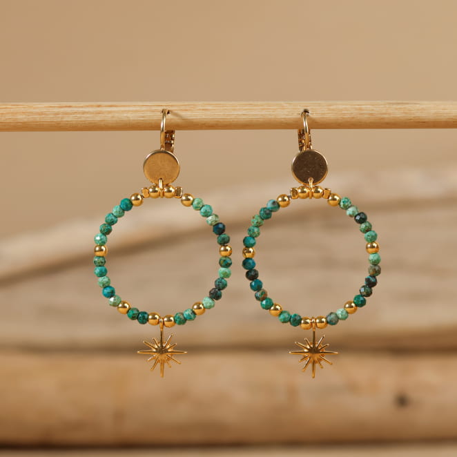 Affirmez votre style avec les boucles d'oreilles créoles Binibeca, des boucles légères qui dansent à chaque mouvement. Leurs perles vertes turquoise évoquent les reflets de l'océan sous le soleil, tandis que l’étoile dorée suspendue capte la lumière comme un éclat marin. Raffinées, colorées et solaires, elles illumineront votre visage avec subtilité et élégance.