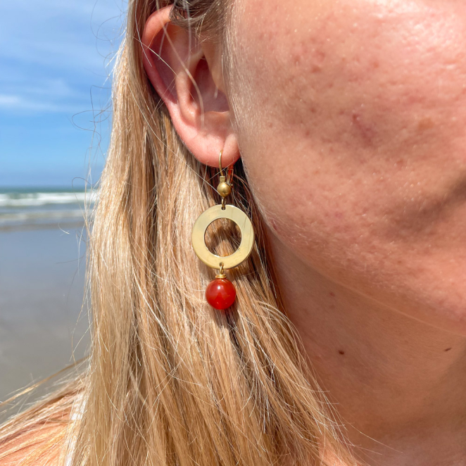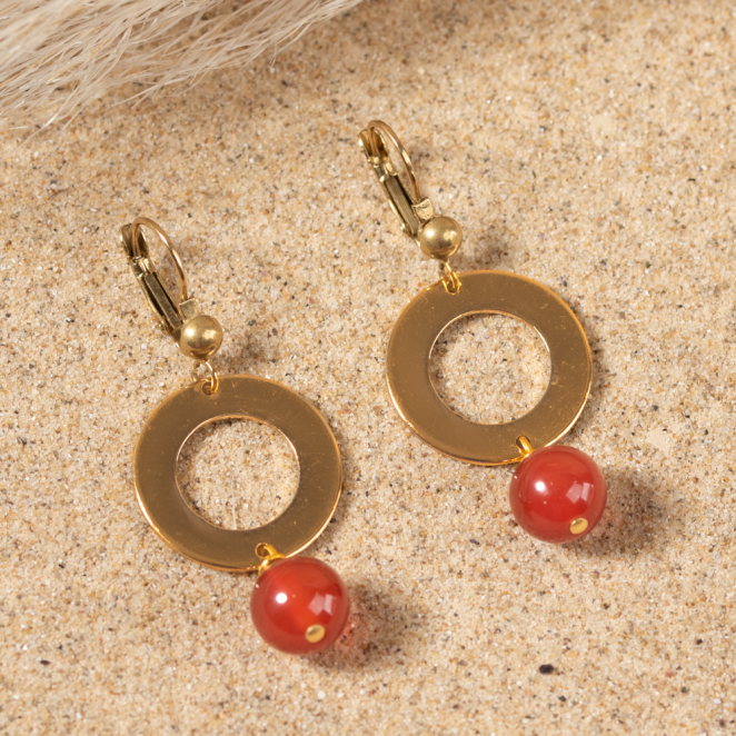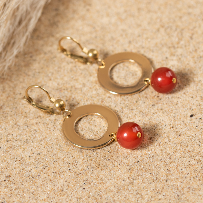 Craquez pour les irrésisitbles boucles d'oreilles Bleuet ! Ces pendantes dorées révèlent un anneau délicat en métal doré, accompagné d'une pierre terracotta aux nuances éblouissantes. Affirmez votre style avec ces bijoux élégants et colorés, ajoutant une touche de raffinement à chaque tenue. Laissez-vous séduire par l'alliance parfaite de sophistication et de charme.