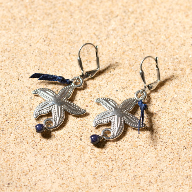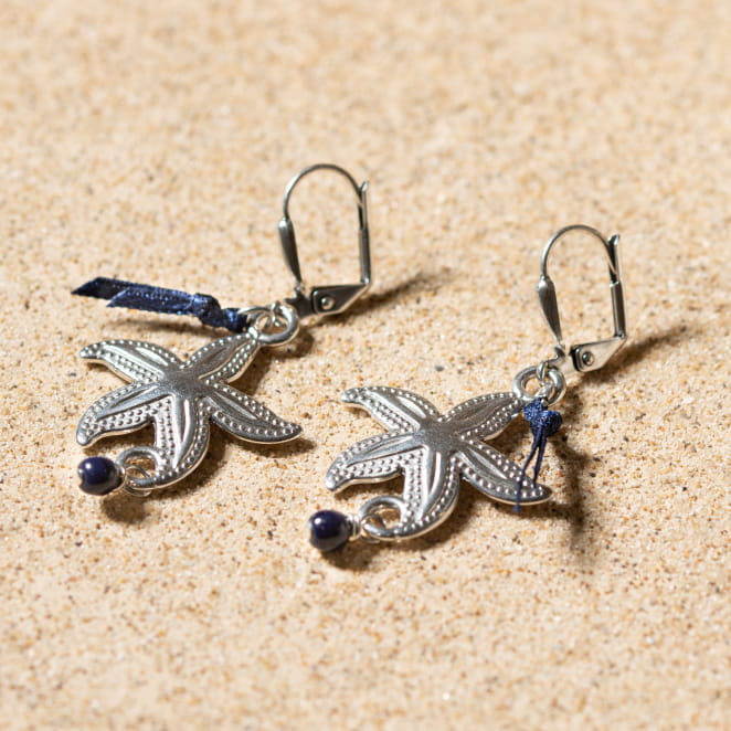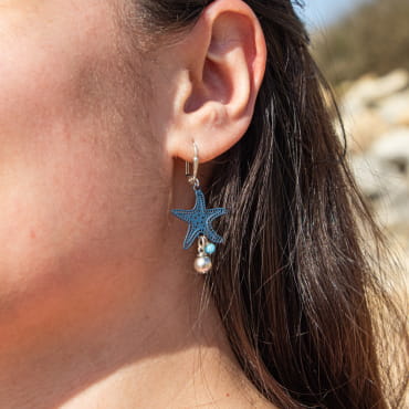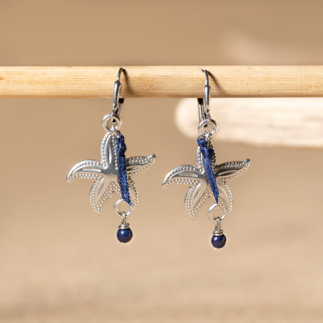 Voyagez le long de la côte Ouest avec ces boucles d'oreilles Bonifacio ! Avec leurs pendentifs étoile de mer argenté et leurs détails bleu marine, ce bijou iodé souffle un air frais et marin. Une création authentique à porter quotidiennement pour accompagner vos différents coiffures.