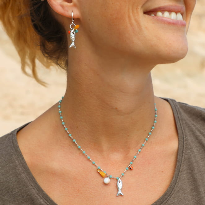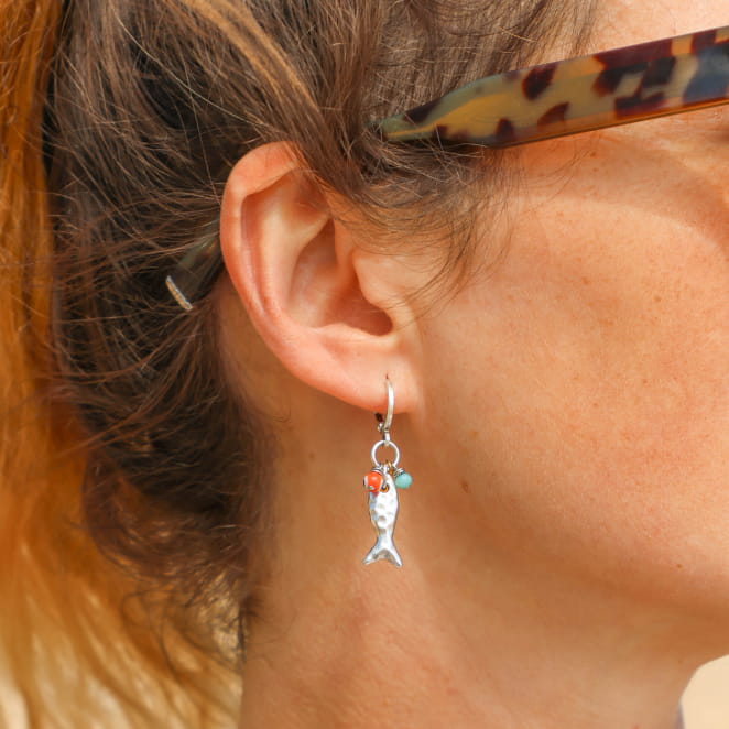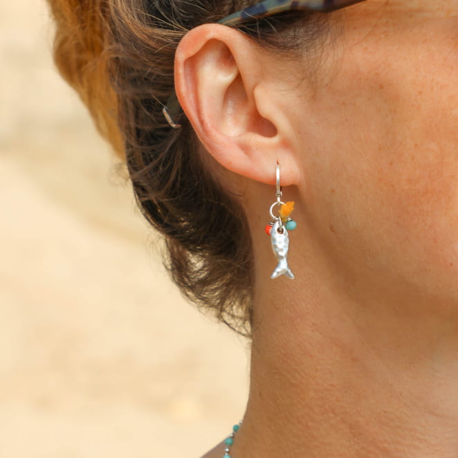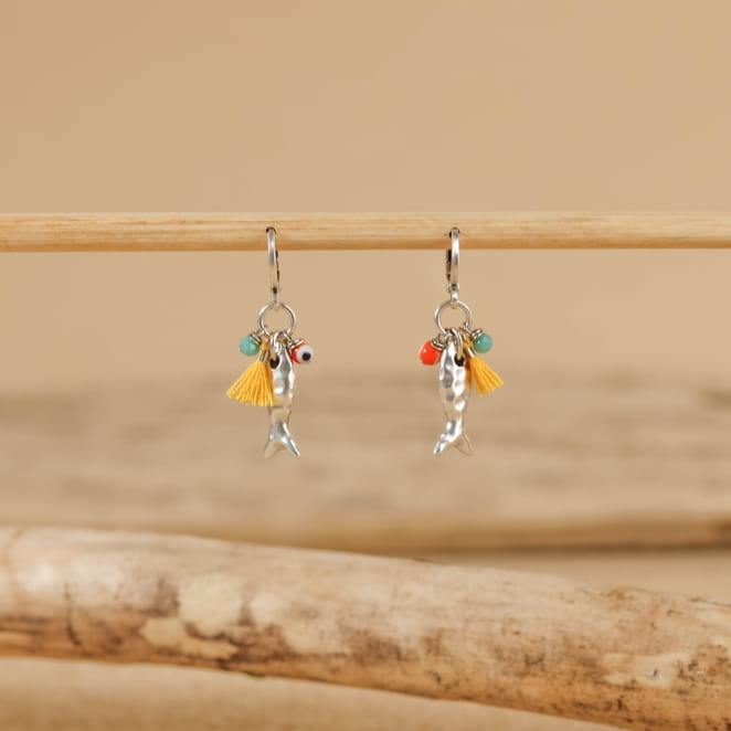 Craquez pour nos boucles d'oreilles Bonita qui insufflent une énergie solaire à votre style. Montées sur dormeuses pour un confort au quotidien, elles associent une perle bleue ciel et orange à un pompon jaune éclatant. Le pendentif poisson argenté vient compléter l’ensemble, un véritable clin d’œil raffiné à l'esprit du bord de mer. Colorées et pétillantes, elles illuminent le visage et apportent une touche colorée irrésistible.